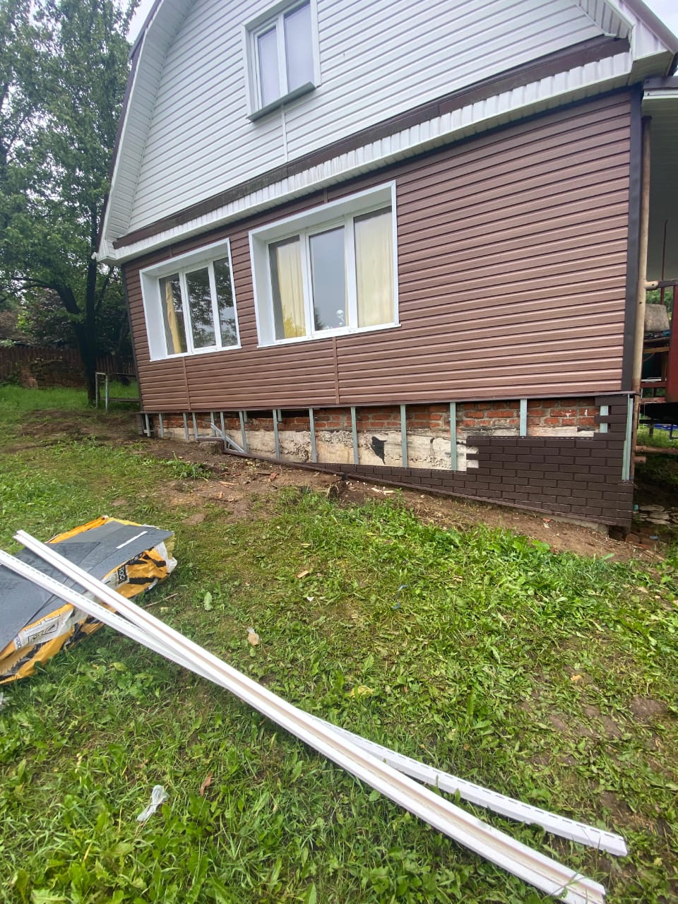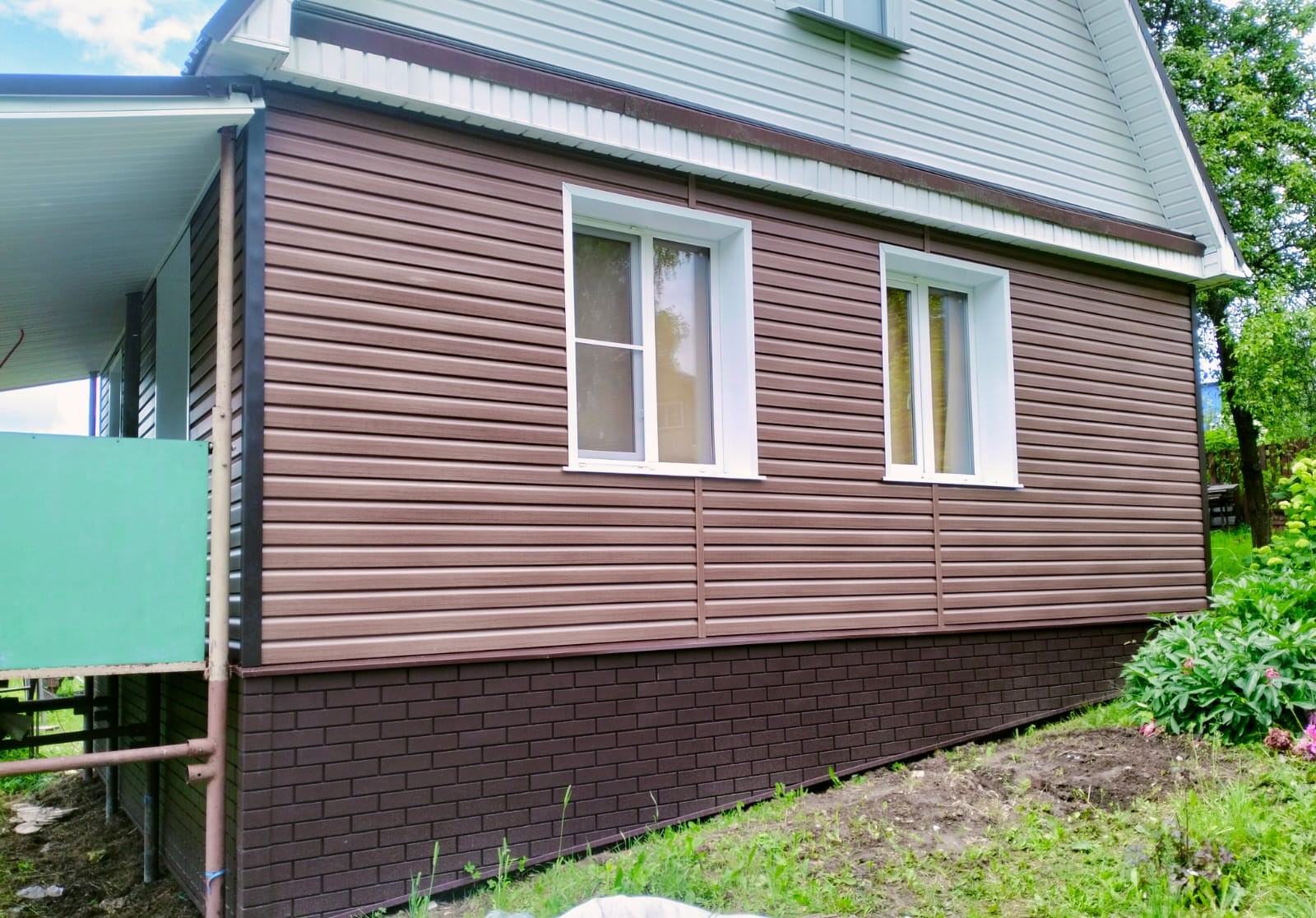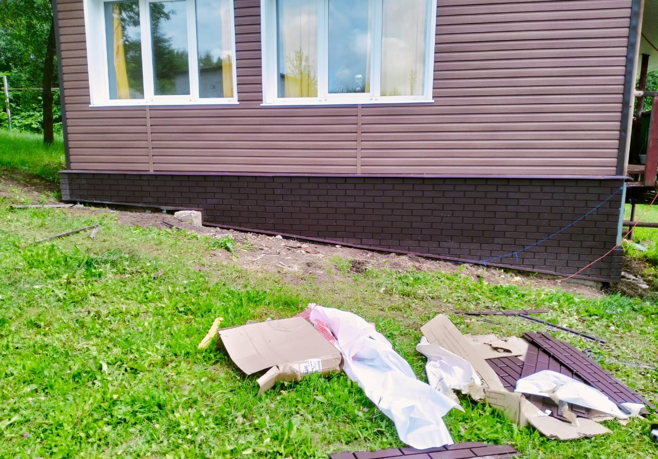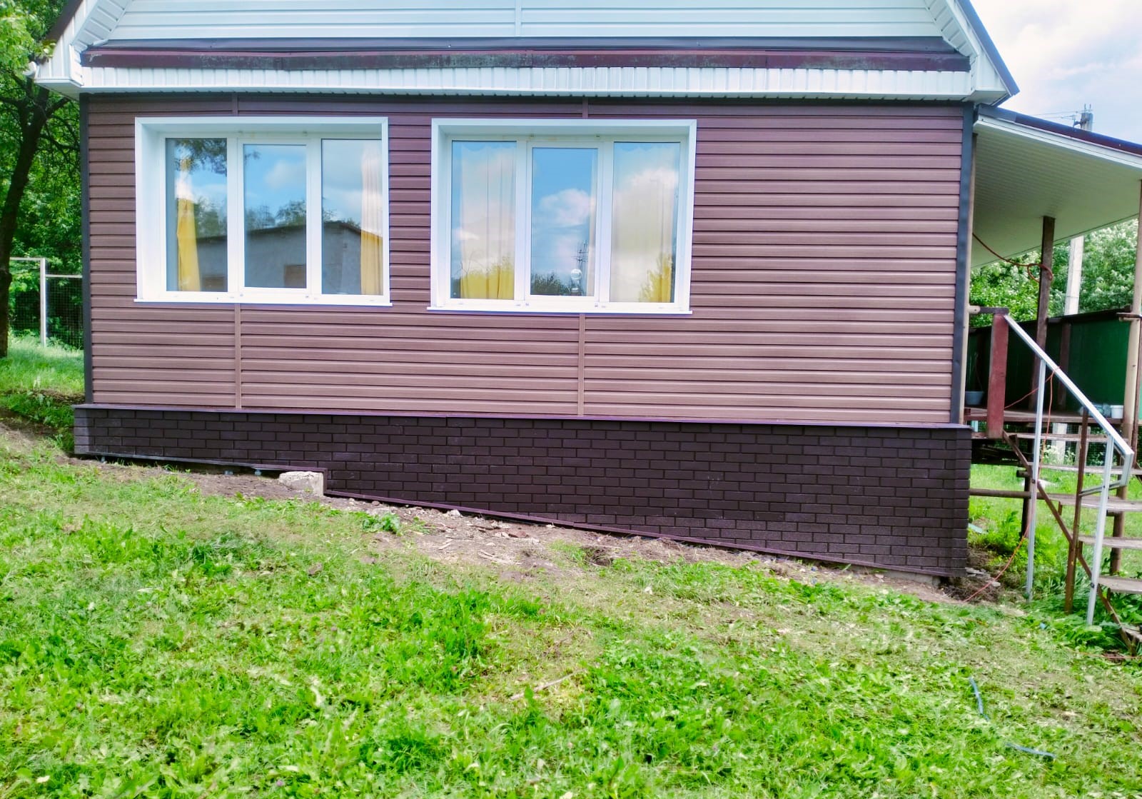 - Цоколь защищен и облицован фасадными панелями.